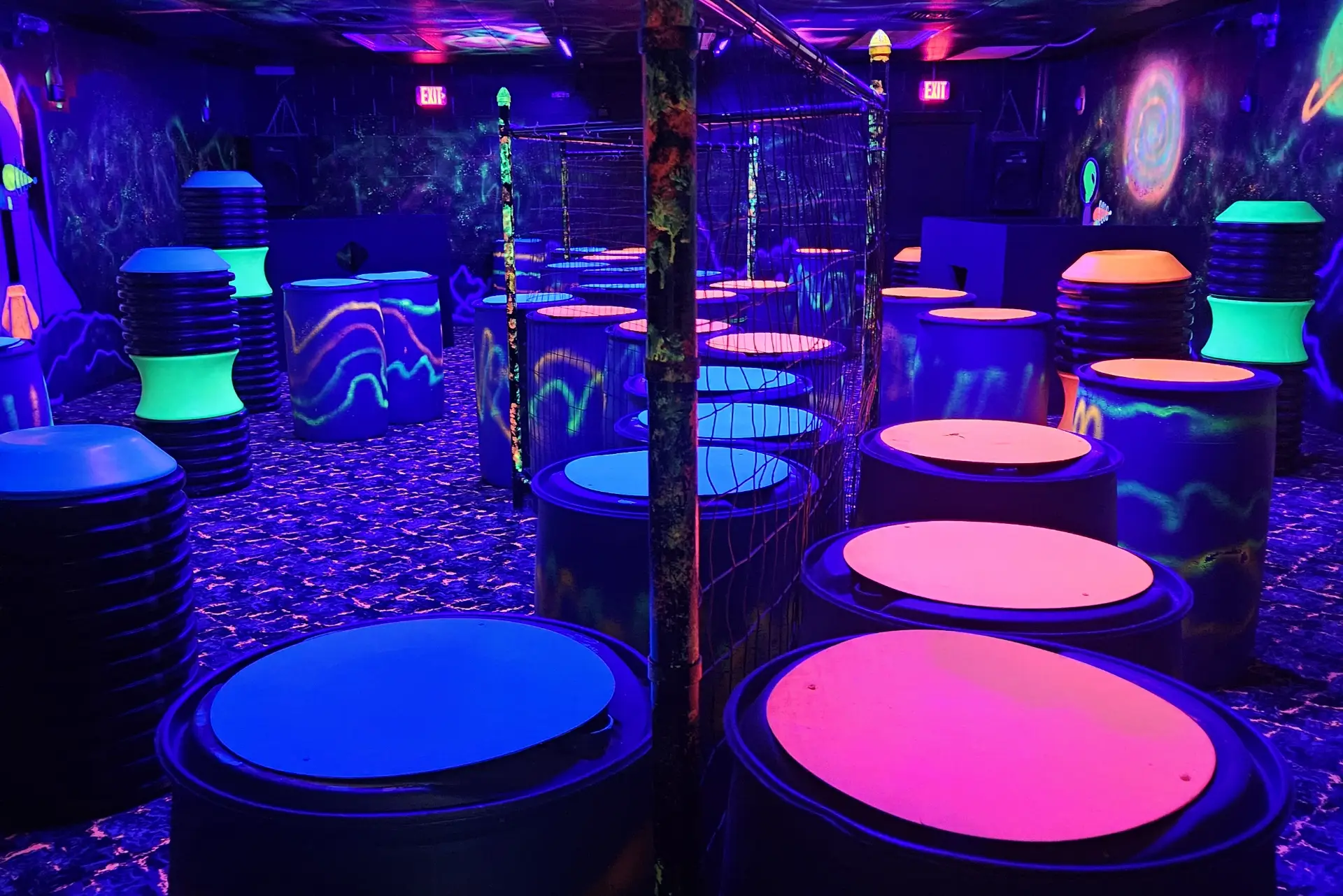 Our arena has a labyrinth of paths with barriers and blocks which can give you refuge from your opponents laser – but beware, they can also trap you momentarily and give your opponent the edge they need. Lights and music also surround you in this adventure.
